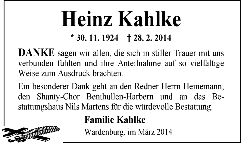 Hier finden Sie alle Traueranzeigen aus der Zeitung, die bisher für Heinz Kahlke erschienen sind. Weitere Traueranzeigen, die in der Zeitung erscheinen, werden hier ebenfalls aufgelistet