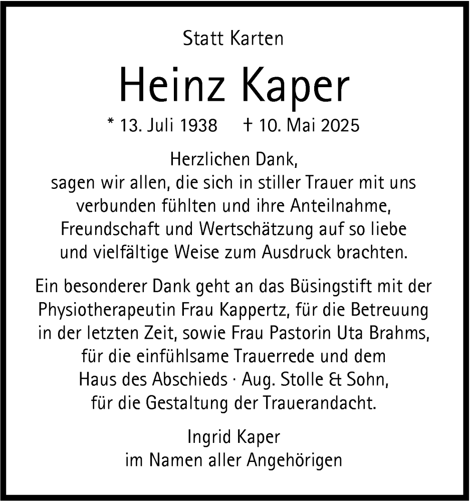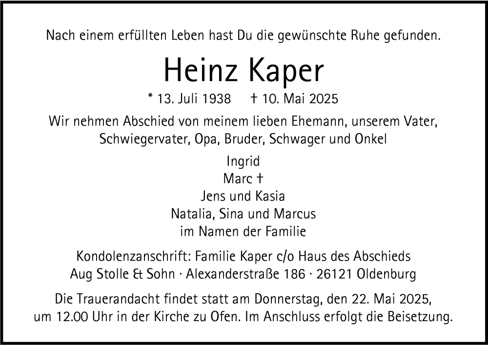 Hier finden Sie alle Traueranzeigen aus der Zeitung, die bisher für Heinz Kaper erschienen sind. Weitere Traueranzeigen, die in der Zeitung erscheinen, werden hier ebenfalls aufgelistet