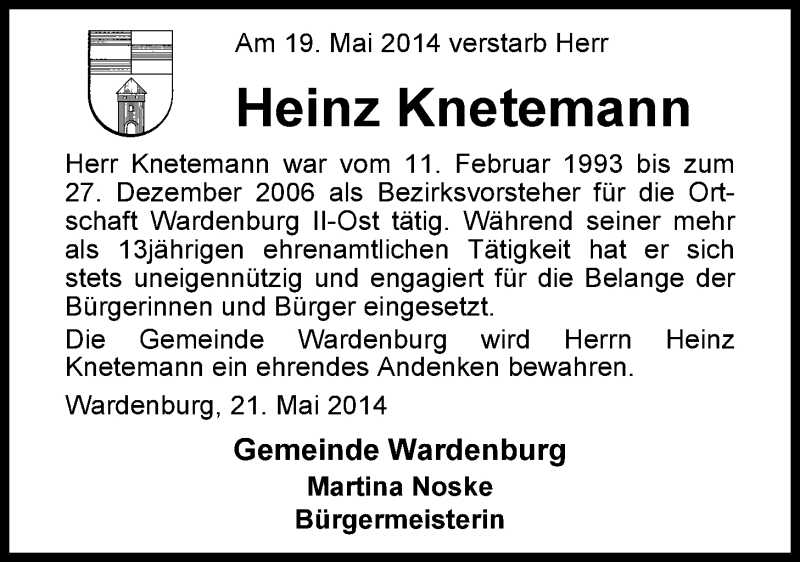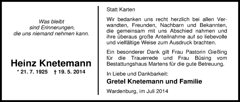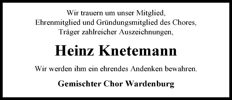 Hier finden Sie alle Traueranzeigen aus der Zeitung, die bisher für Heinz Knetemann erschienen sind. Weitere Traueranzeigen, die in der Zeitung erscheinen, werden hier ebenfalls aufgelistet
