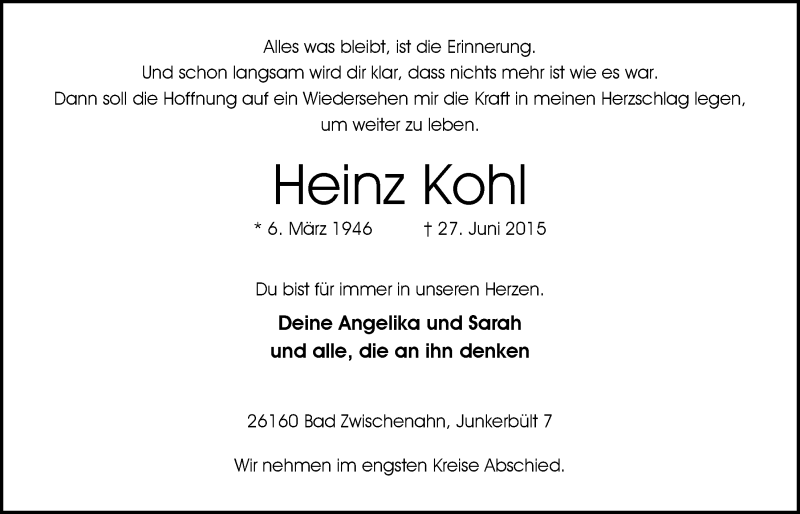 Hier finden Sie alle Traueranzeigen aus der Zeitung, die bisher für Heinz Kohl erschienen sind. Weitere Traueranzeigen, die in der Zeitung erscheinen, werden hier ebenfalls aufgelistet