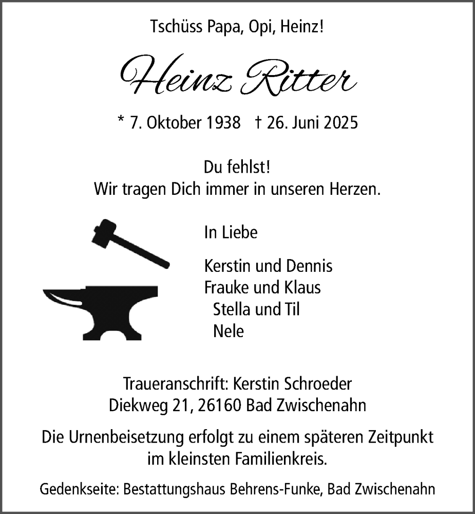 Hier finden Sie alle Traueranzeigen aus der Zeitung, die bisher für Heinz Ritter erschienen sind. Weitere Traueranzeigen, die in der Zeitung erscheinen, werden hier ebenfalls aufgelistet