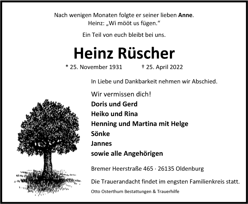 Hier finden Sie alle Traueranzeigen aus der Zeitung, die bisher für Heinz Rüscher erschienen sind. Weitere Traueranzeigen, die in der Zeitung erscheinen, werden hier ebenfalls aufgelistet