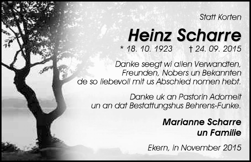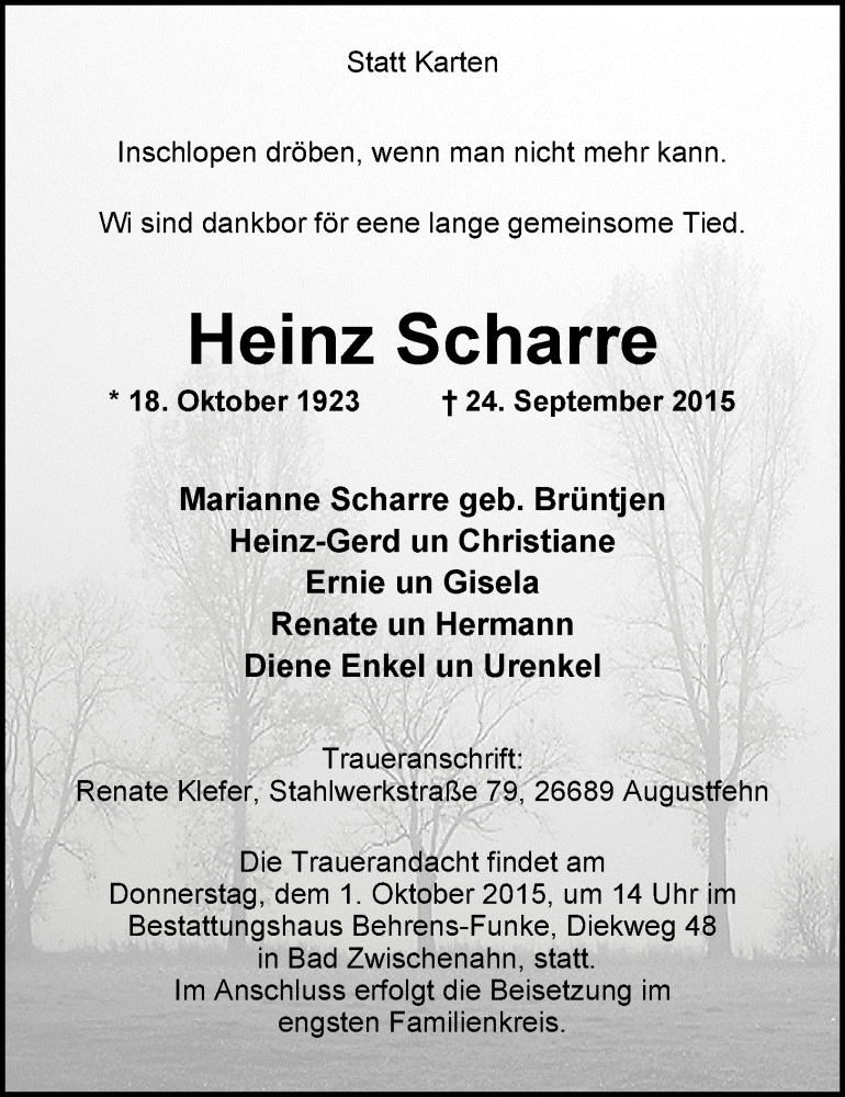 Hier finden Sie alle Traueranzeigen aus der Zeitung, die bisher für Heinz Scharre erschienen sind. Weitere Traueranzeigen, die in der Zeitung erscheinen, werden hier ebenfalls aufgelistet