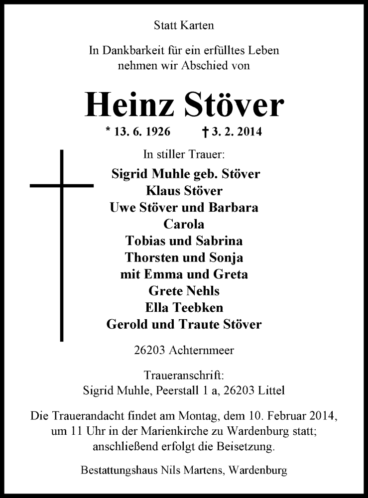 Hier finden Sie alle Traueranzeigen aus der Zeitung, die bisher für Heinz Stöver erschienen sind. Weitere Traueranzeigen, die in der Zeitung erscheinen, werden hier ebenfalls aufgelistet