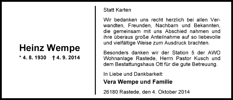Hier finden Sie alle Traueranzeigen aus der Zeitung, die bisher für Heinz Wempe erschienen sind. Weitere Traueranzeigen, die in der Zeitung erscheinen, werden hier ebenfalls aufgelistet