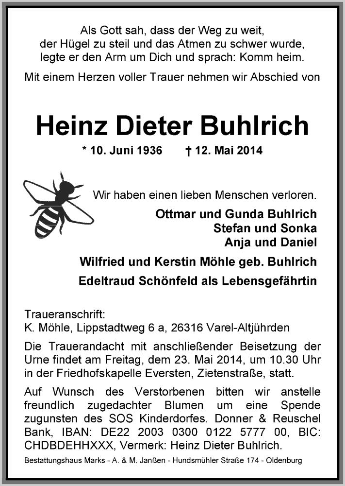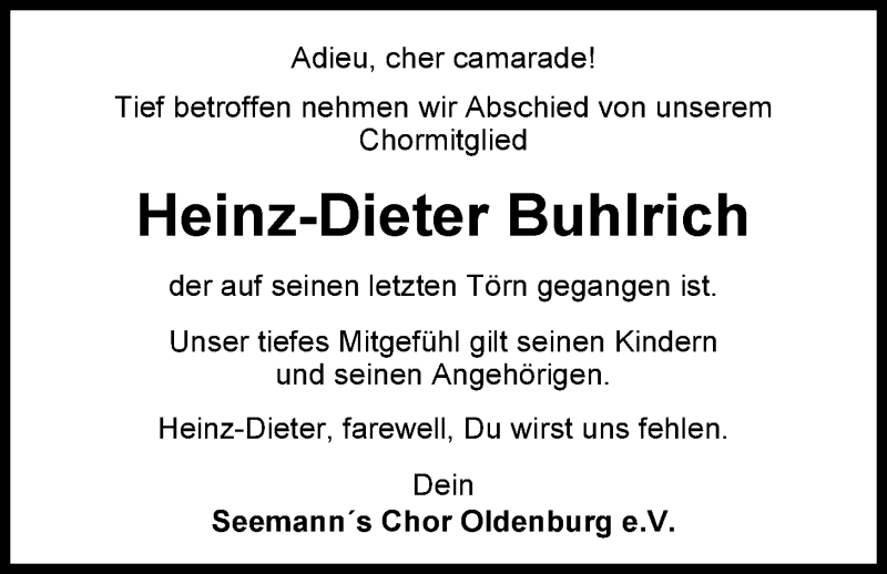 Hier finden Sie alle Traueranzeigen aus der Zeitung, die bisher für Heinz Dieter Buhlrich erschienen sind. Weitere Traueranzeigen, die in der Zeitung erscheinen, werden hier ebenfalls aufgelistet
