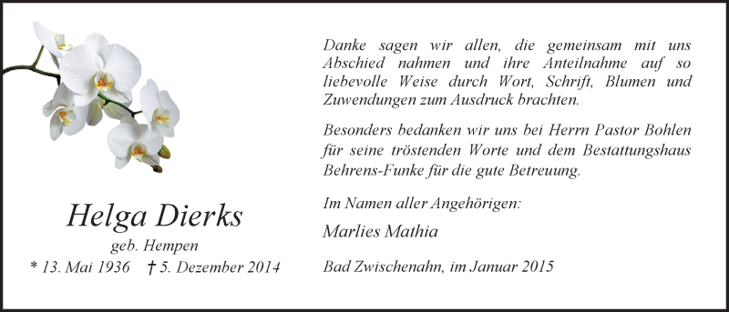 Hier finden Sie alle Traueranzeigen aus der Zeitung, die bisher für Helga Dierks erschienen sind. Weitere Traueranzeigen, die in der Zeitung erscheinen, werden hier ebenfalls aufgelistet