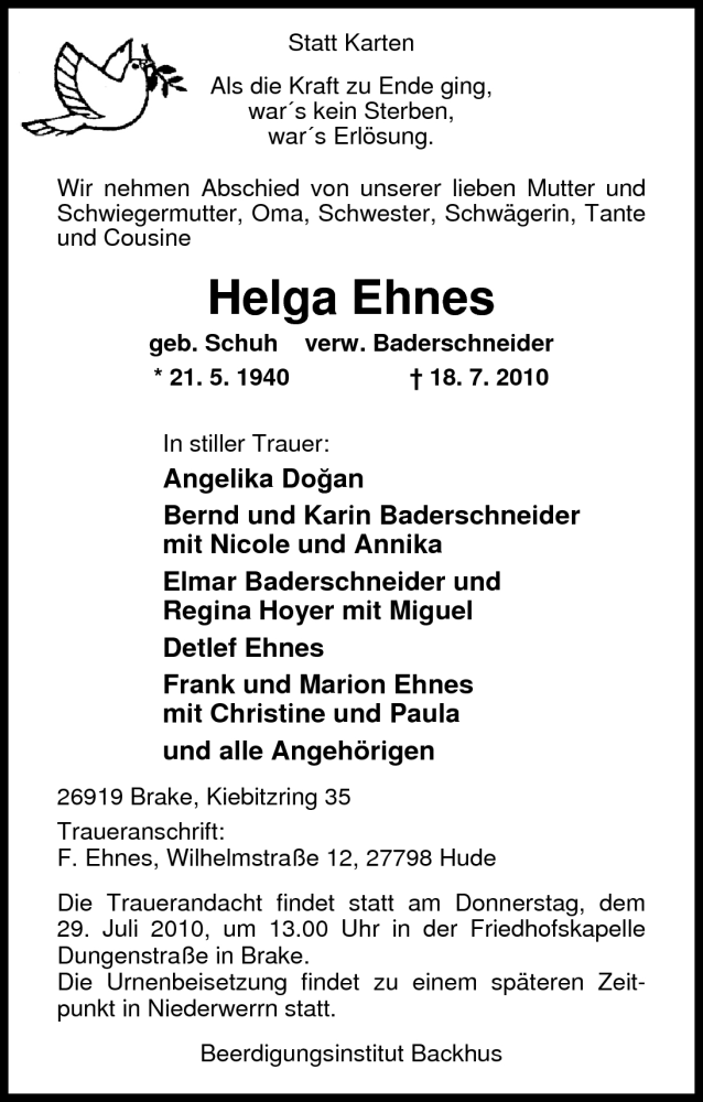 Hier finden Sie alle Traueranzeigen aus der Zeitung, die bisher für Helga Ehnes erschienen sind. Weitere Traueranzeigen, die in der Zeitung erscheinen, werden hier ebenfalls aufgelistet