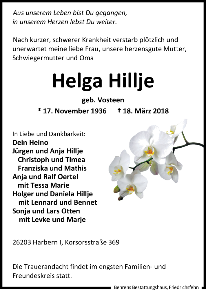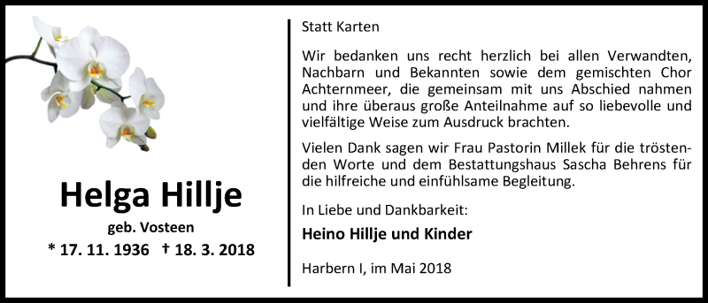 Hier finden Sie alle Traueranzeigen aus der Zeitung, die bisher für Helga Hillje erschienen sind. Weitere Traueranzeigen, die in der Zeitung erscheinen, werden hier ebenfalls aufgelistet