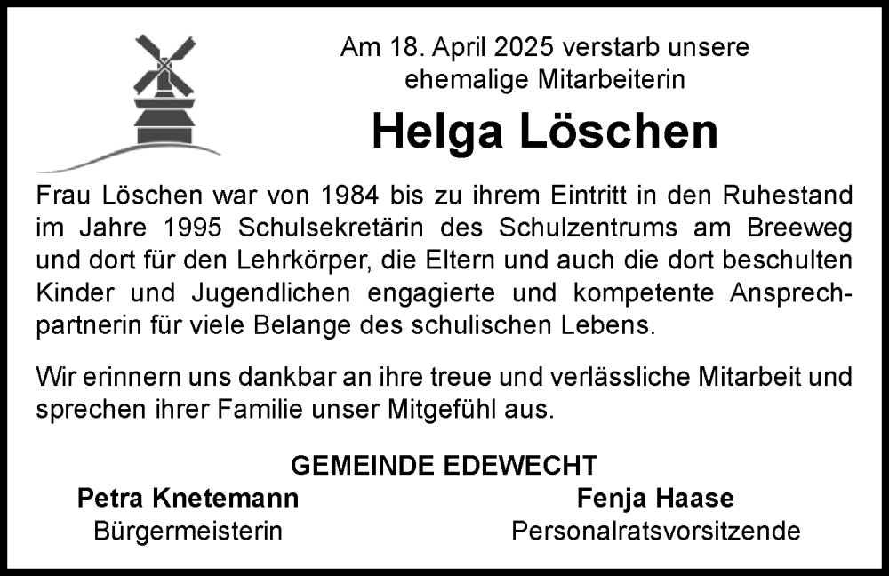 Hier finden Sie alle Traueranzeigen aus der Zeitung, die bisher für Helga Löschen erschienen sind. Weitere Traueranzeigen, die in der Zeitung erscheinen, werden hier ebenfalls aufgelistet