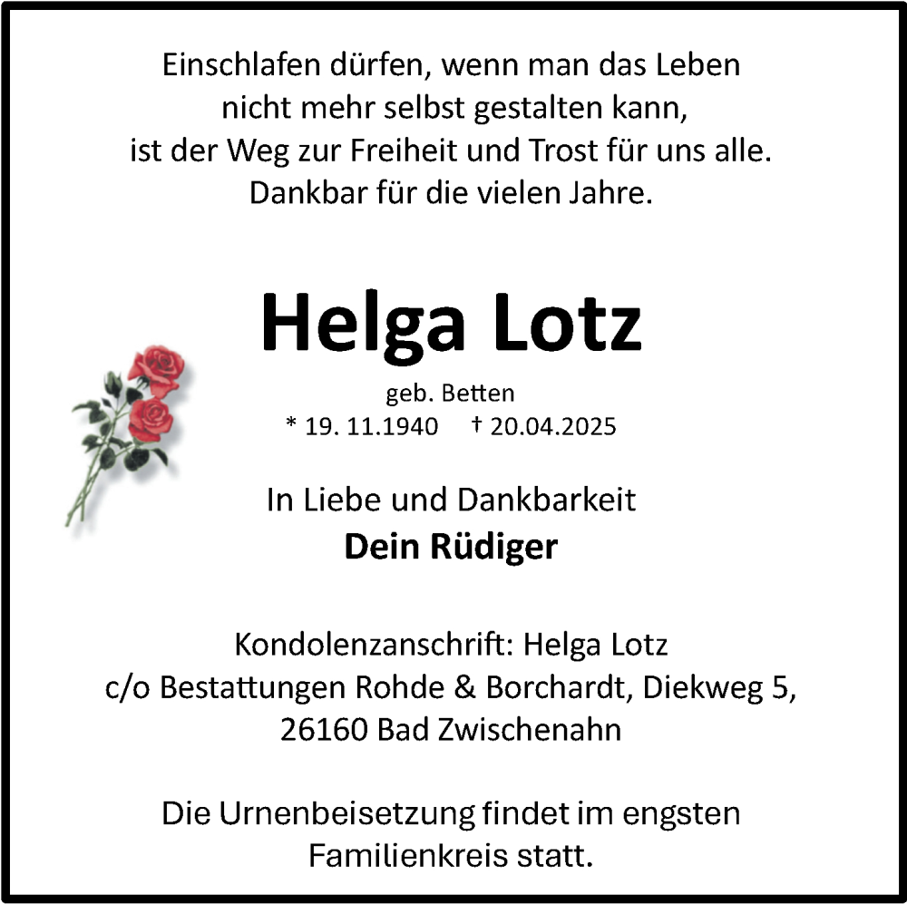 Hier finden Sie alle Traueranzeigen aus der Zeitung, die bisher für Helga Lotz erschienen sind. Weitere Traueranzeigen, die in der Zeitung erscheinen, werden hier ebenfalls aufgelistet