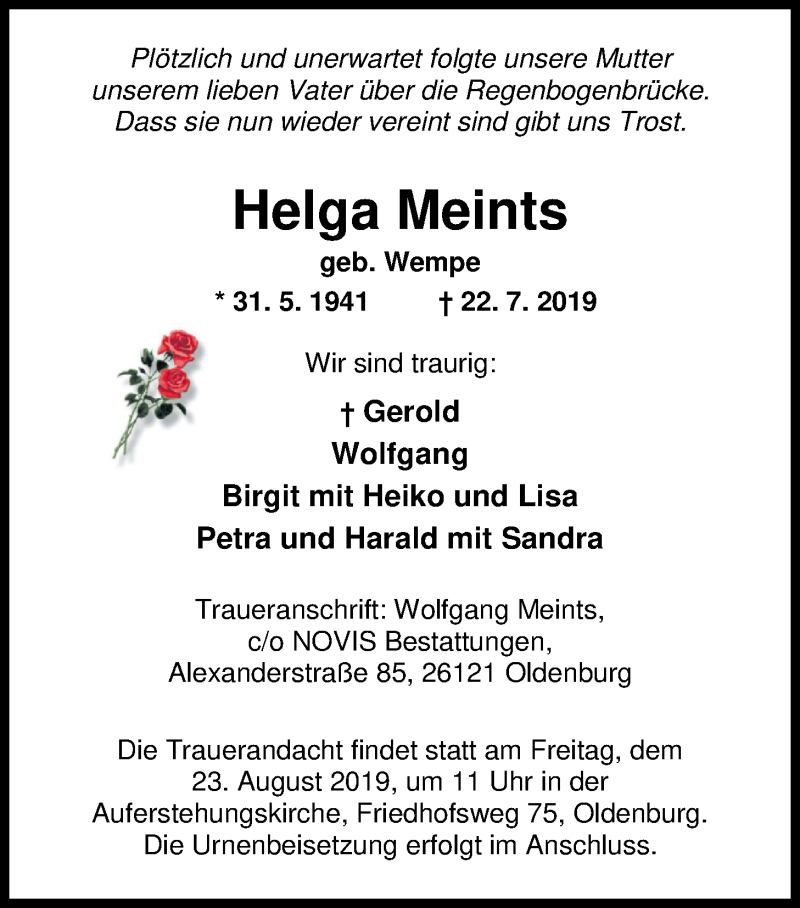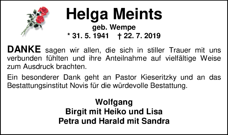 Hier finden Sie alle Traueranzeigen aus der Zeitung, die bisher für Helga Meints erschienen sind. Weitere Traueranzeigen, die in der Zeitung erscheinen, werden hier ebenfalls aufgelistet