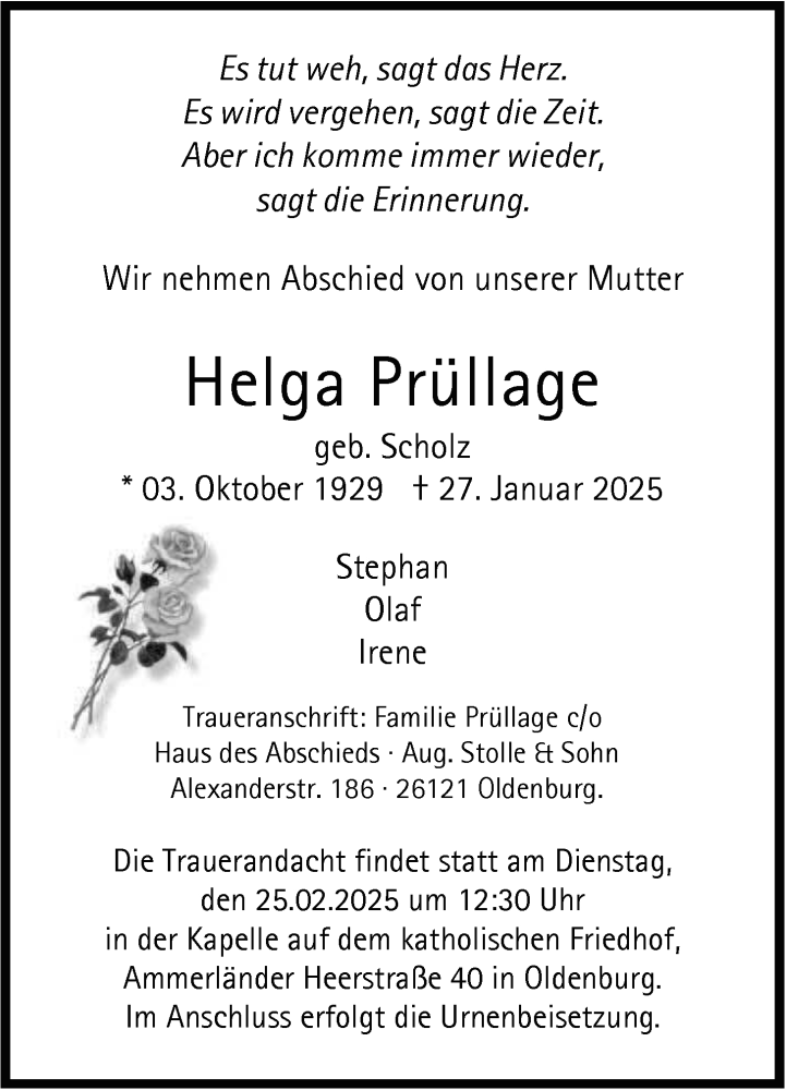 Hier finden Sie alle Traueranzeigen aus der Zeitung, die bisher für Helga Prüllage erschienen sind. Weitere Traueranzeigen, die in der Zeitung erscheinen, werden hier ebenfalls aufgelistet