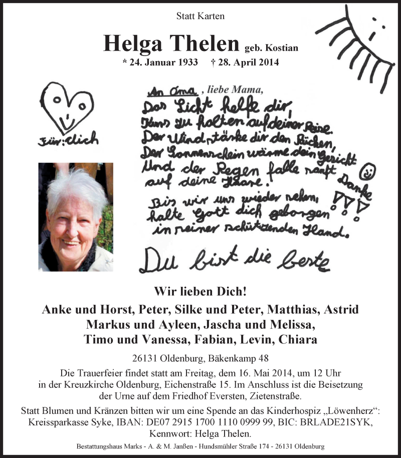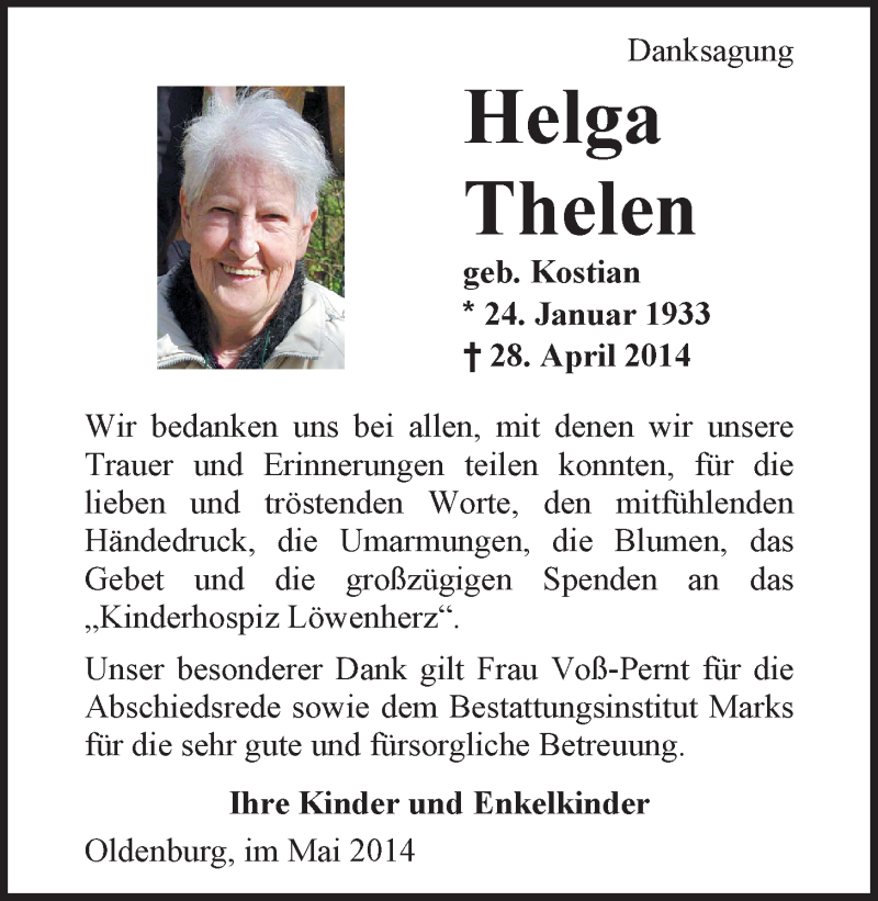 Hier finden Sie alle Traueranzeigen aus der Zeitung, die bisher für Helga Thelen erschienen sind. Weitere Traueranzeigen, die in der Zeitung erscheinen, werden hier ebenfalls aufgelistet
