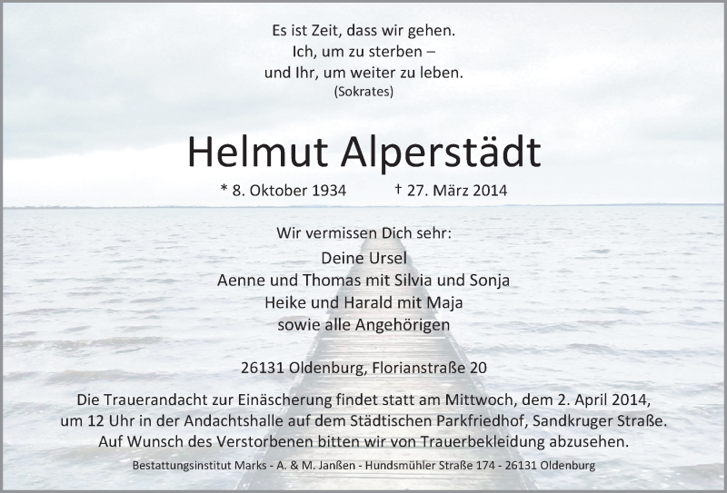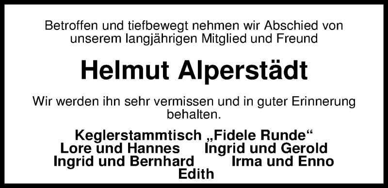 Hier finden Sie alle Traueranzeigen aus der Zeitung, die bisher für Helmut Alperstädt erschienen sind. Weitere Traueranzeigen, die in der Zeitung erscheinen, werden hier ebenfalls aufgelistet