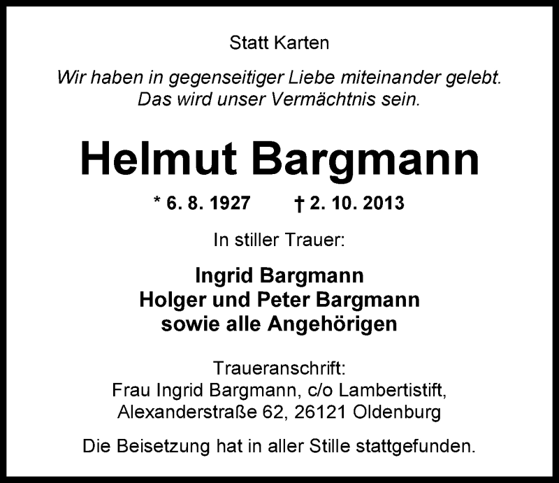 Hier finden Sie alle Traueranzeigen aus der Zeitung, die bisher für Helmut Bargmann erschienen sind. Weitere Traueranzeigen, die in der Zeitung erscheinen, werden hier ebenfalls aufgelistet
