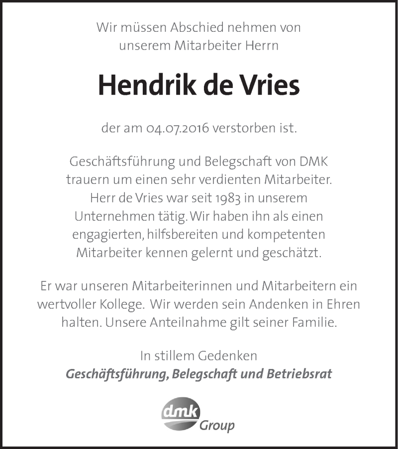 Hier finden Sie alle Traueranzeigen aus der Zeitung, die bisher für Hendrik de Vries erschienen sind. Weitere Traueranzeigen, die in der Zeitung erscheinen, werden hier ebenfalls aufgelistet