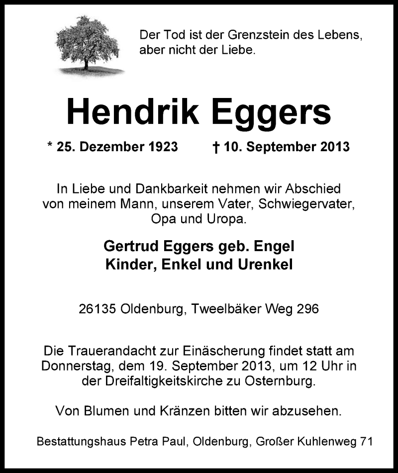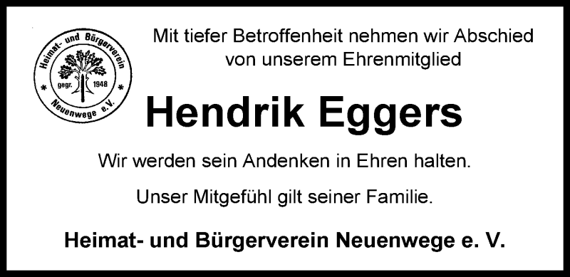 Hier finden Sie alle Traueranzeigen aus der Zeitung, die bisher für Hendrik Eggers erschienen sind. Weitere Traueranzeigen, die in der Zeitung erscheinen, werden hier ebenfalls aufgelistet