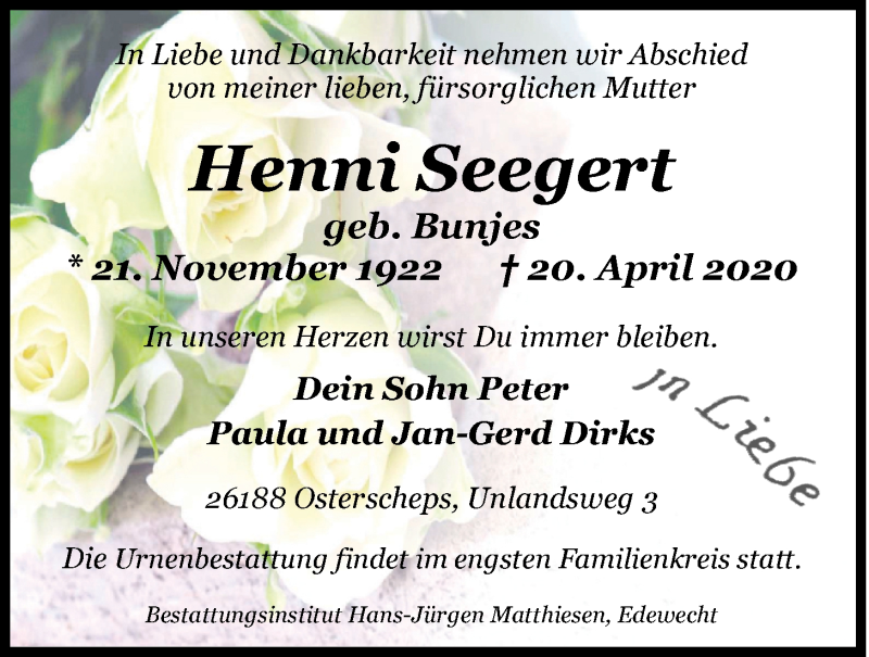 Hier finden Sie alle Traueranzeigen aus der Zeitung, die bisher für Henni Seegert erschienen sind. Weitere Traueranzeigen, die in der Zeitung erscheinen, werden hier ebenfalls aufgelistet