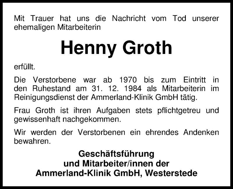 Hier finden Sie alle Traueranzeigen aus der Zeitung, die bisher für Henny Groth erschienen sind. Weitere Traueranzeigen, die in der Zeitung erscheinen, werden hier ebenfalls aufgelistet