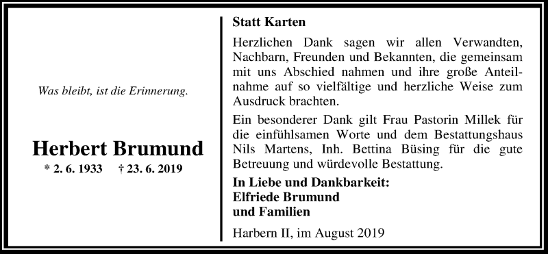 Hier finden Sie alle Traueranzeigen aus der Zeitung, die bisher für Herbert Brumund erschienen sind. Weitere Traueranzeigen, die in der Zeitung erscheinen, werden hier ebenfalls aufgelistet