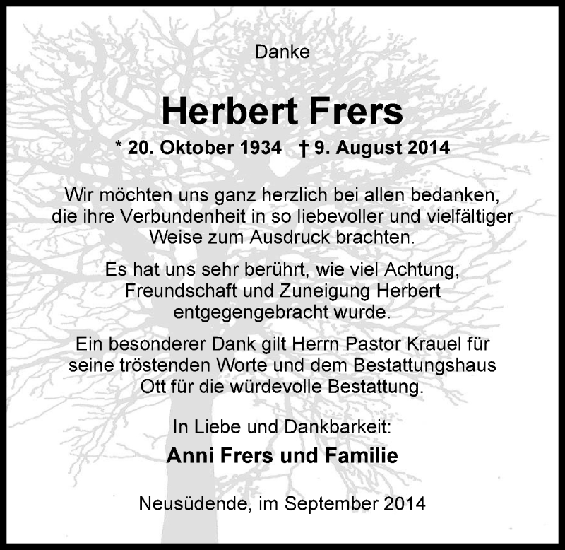 Hier finden Sie alle Traueranzeigen aus der Zeitung, die bisher für Herbert Frers erschienen sind. Weitere Traueranzeigen, die in der Zeitung erscheinen, werden hier ebenfalls aufgelistet