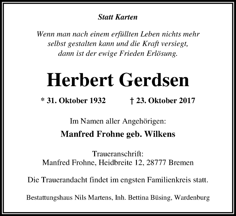 Hier finden Sie alle Traueranzeigen aus der Zeitung, die bisher für Herbert Gerdsen erschienen sind. Weitere Traueranzeigen, die in der Zeitung erscheinen, werden hier ebenfalls aufgelistet