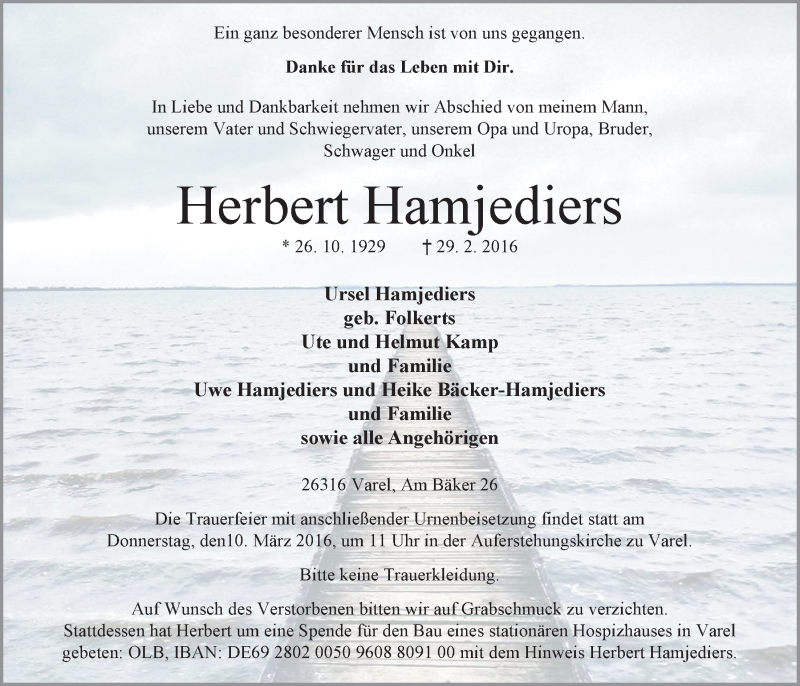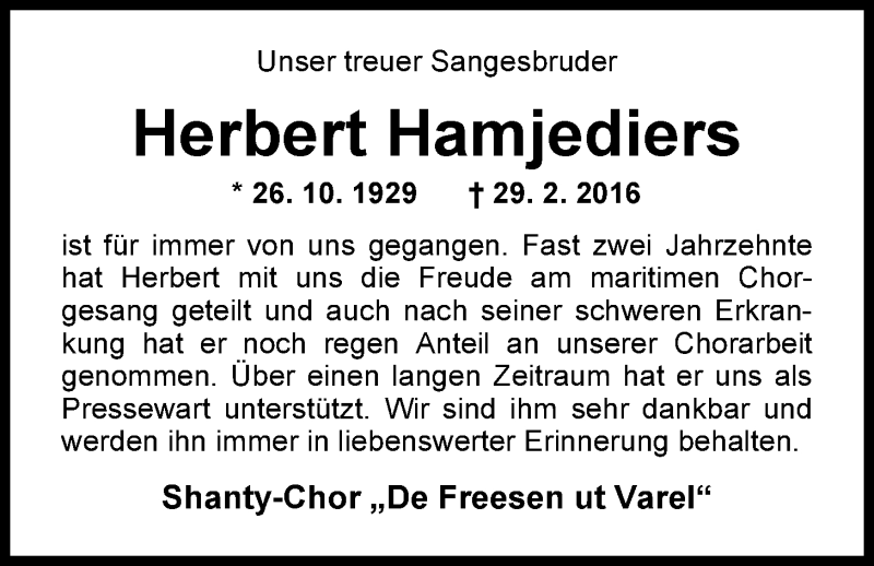 Hier finden Sie alle Traueranzeigen aus der Zeitung, die bisher für Herbert Hamjediers erschienen sind. Weitere Traueranzeigen, die in der Zeitung erscheinen, werden hier ebenfalls aufgelistet