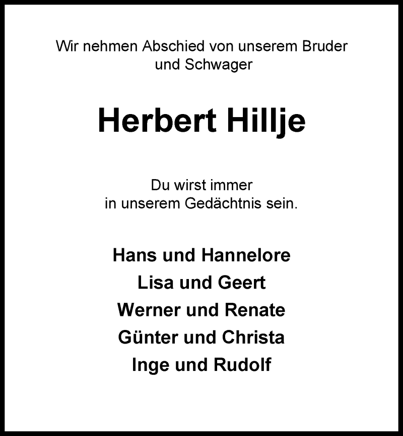 Hier finden Sie alle Traueranzeigen aus der Zeitung, die bisher für Herbert Hillje erschienen sind. Weitere Traueranzeigen, die in der Zeitung erscheinen, werden hier ebenfalls aufgelistet