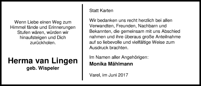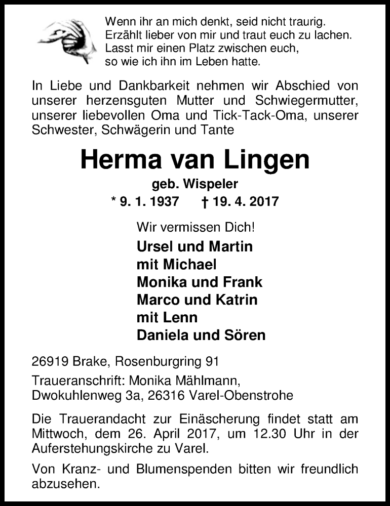 Hier finden Sie alle Traueranzeigen aus der Zeitung, die bisher für Herma van Lingen erschienen sind. Weitere Traueranzeigen, die in der Zeitung erscheinen, werden hier ebenfalls aufgelistet