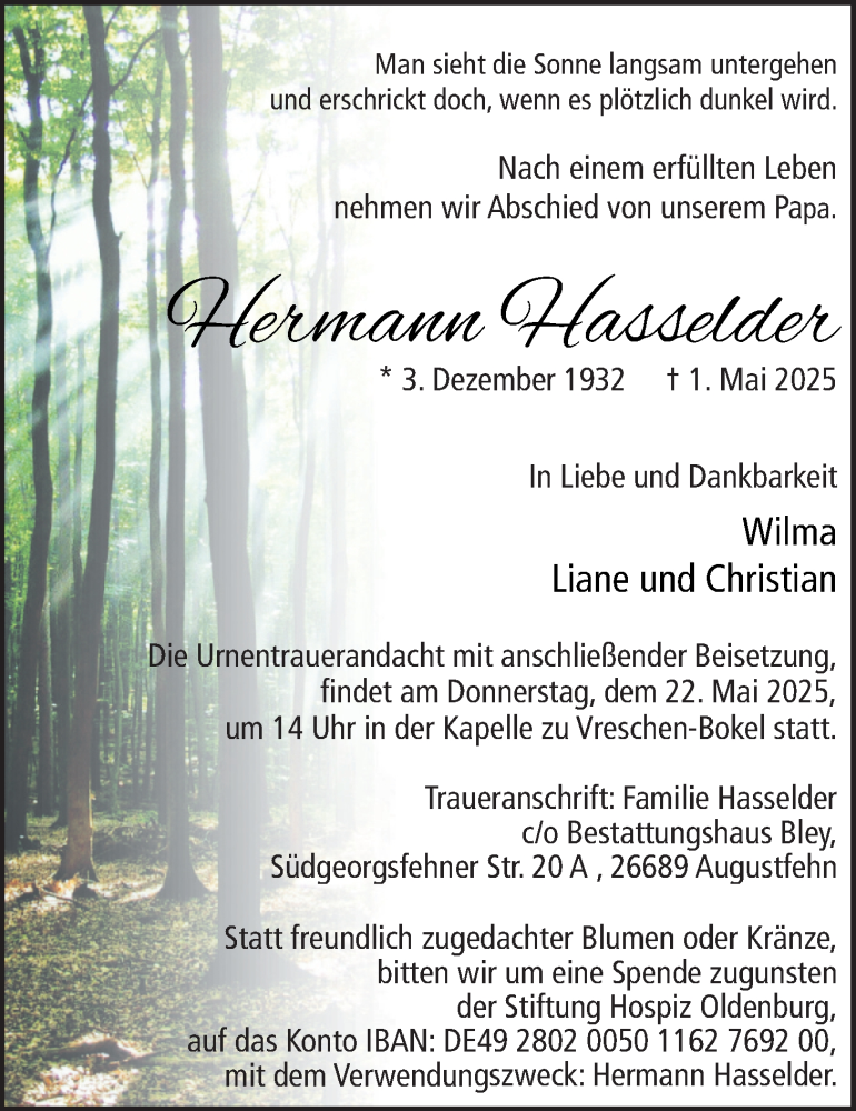 Hier finden Sie alle Traueranzeigen aus der Zeitung, die bisher für Hermann Hasselder erschienen sind. Weitere Traueranzeigen, die in der Zeitung erscheinen, werden hier ebenfalls aufgelistet