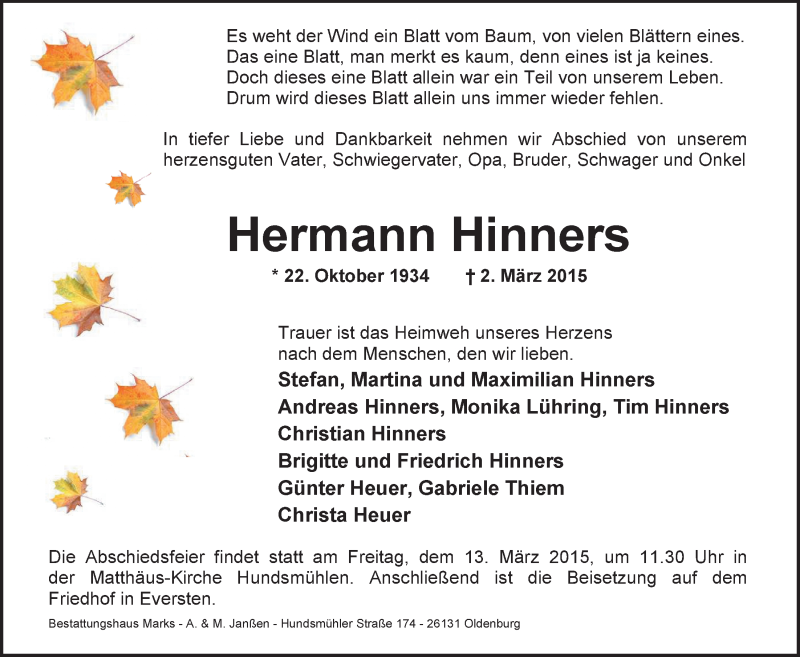 Hier finden Sie alle Traueranzeigen aus der Zeitung, die bisher für Hermann Hinners erschienen sind. Weitere Traueranzeigen, die in der Zeitung erscheinen, werden hier ebenfalls aufgelistet