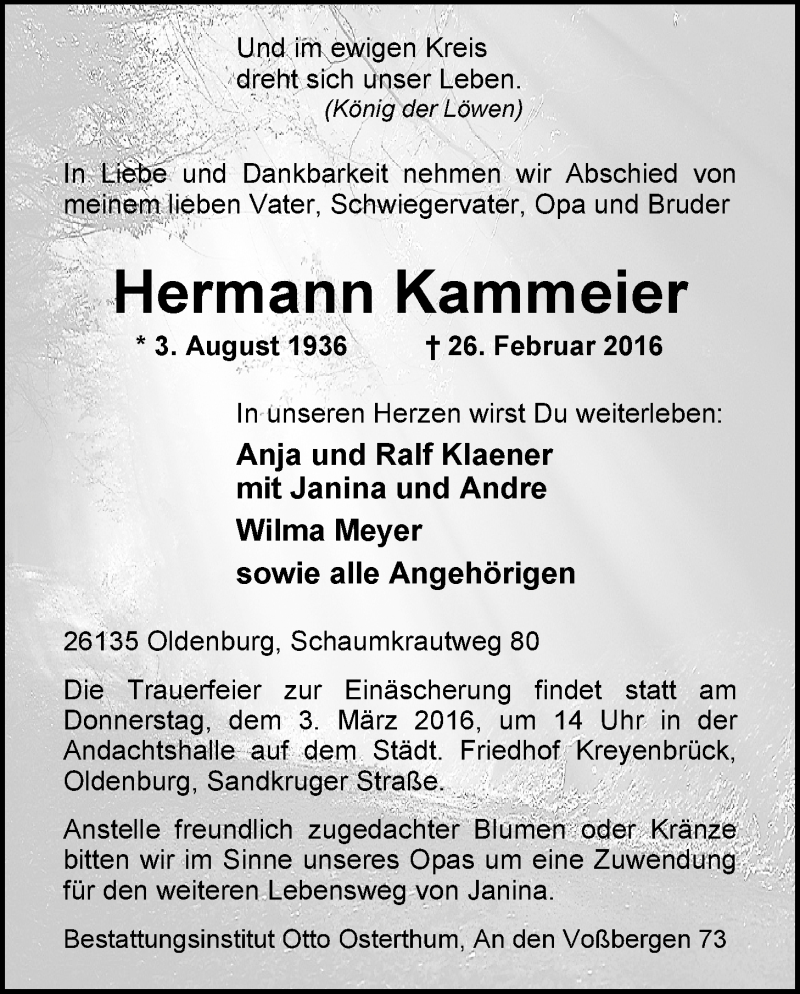 Hier finden Sie alle Traueranzeigen aus der Zeitung, die bisher für Hermann Kammeier erschienen sind. Weitere Traueranzeigen, die in der Zeitung erscheinen, werden hier ebenfalls aufgelistet