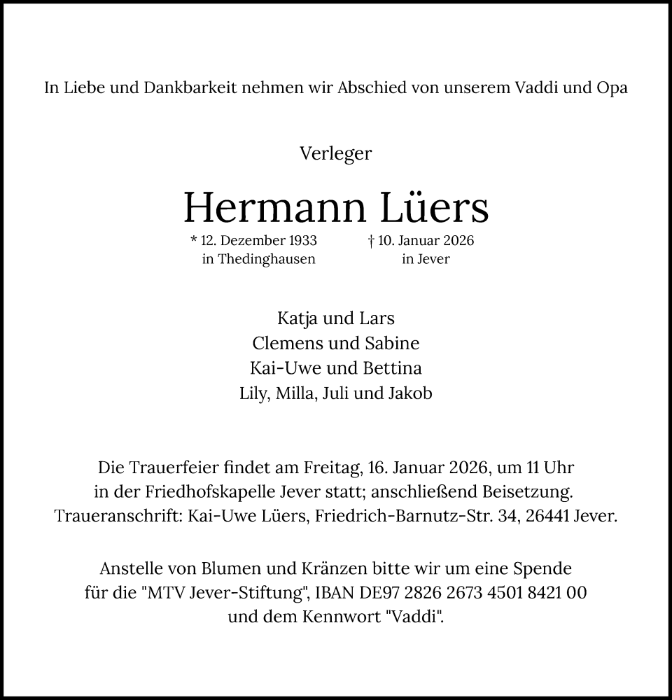 Hier finden Sie alle Traueranzeigen aus der Zeitung, die bisher für Hermann Lüers erschienen sind. Weitere Traueranzeigen, die in der Zeitung erscheinen, werden hier ebenfalls aufgelistet