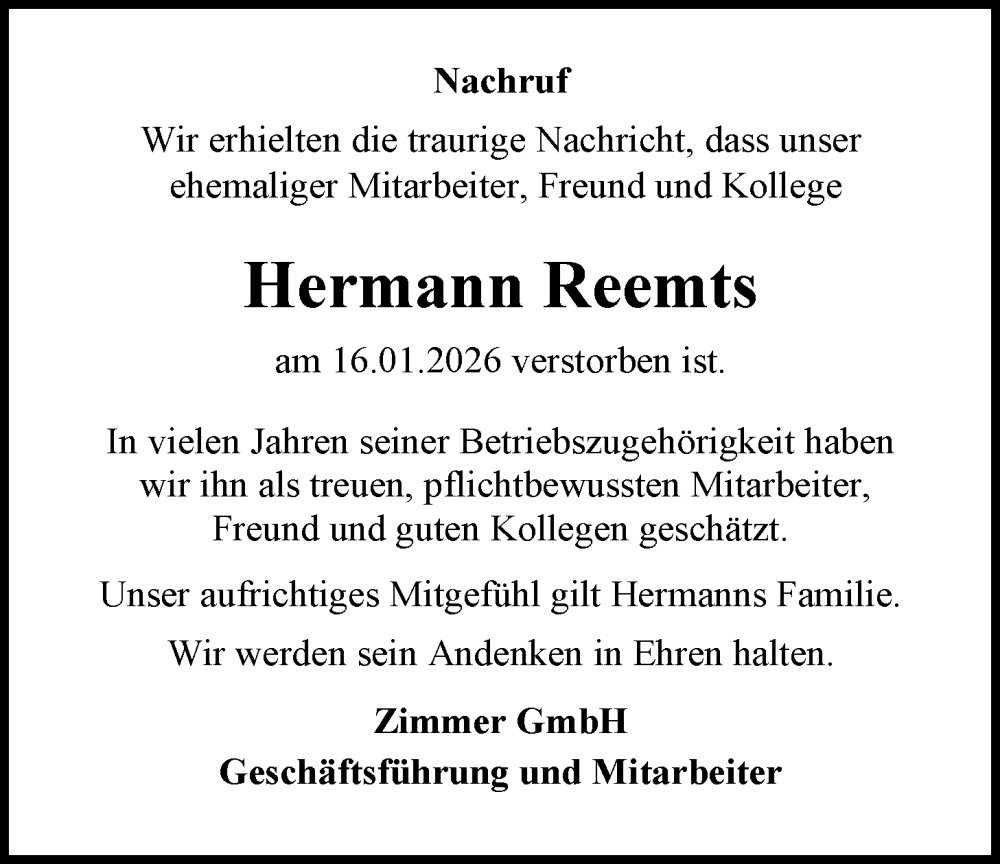 Hier finden Sie alle Traueranzeigen aus der Zeitung, die bisher für Hermann Reemts erschienen sind. Weitere Traueranzeigen, die in der Zeitung erscheinen, werden hier ebenfalls aufgelistet
