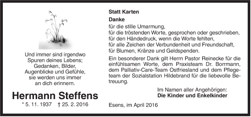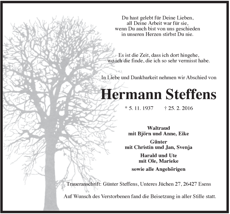 Hier finden Sie alle Traueranzeigen aus der Zeitung, die bisher für Hermann Steffens erschienen sind. Weitere Traueranzeigen, die in der Zeitung erscheinen, werden hier ebenfalls aufgelistet