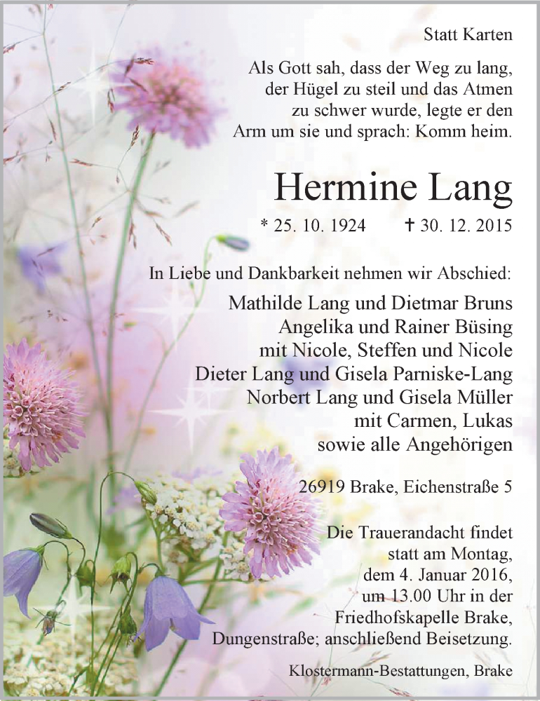 Hier finden Sie alle Traueranzeigen aus der Zeitung, die bisher für Hermine Lang erschienen sind. Weitere Traueranzeigen, die in der Zeitung erscheinen, werden hier ebenfalls aufgelistet