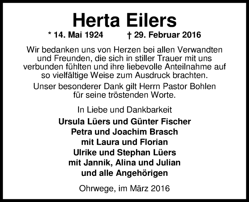 Hier finden Sie alle Traueranzeigen aus der Zeitung, die bisher für Herta Eilers erschienen sind. Weitere Traueranzeigen, die in der Zeitung erscheinen, werden hier ebenfalls aufgelistet