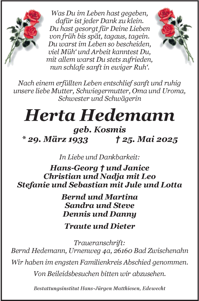Hier finden Sie alle Traueranzeigen aus der Zeitung, die bisher für Herta Hedemann erschienen sind. Weitere Traueranzeigen, die in der Zeitung erscheinen, werden hier ebenfalls aufgelistet