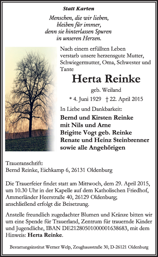 Hier finden Sie alle Traueranzeigen aus der Zeitung, die bisher für Herta Reinke erschienen sind. Weitere Traueranzeigen, die in der Zeitung erscheinen, werden hier ebenfalls aufgelistet