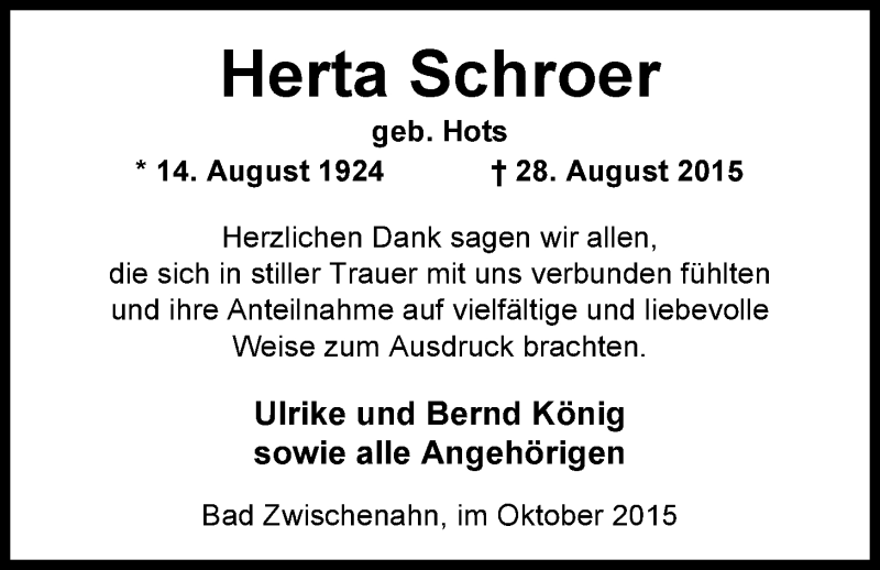 Hier finden Sie alle Traueranzeigen aus der Zeitung, die bisher für Herta Schroer erschienen sind. Weitere Traueranzeigen, die in der Zeitung erscheinen, werden hier ebenfalls aufgelistet