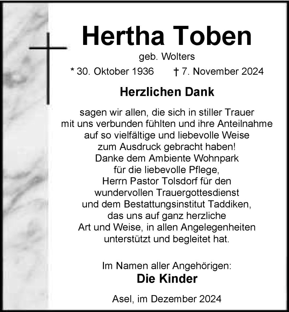 Hier finden Sie alle Traueranzeigen aus der Zeitung, die bisher für Hertha Toben erschienen sind. Weitere Traueranzeigen, die in der Zeitung erscheinen, werden hier ebenfalls aufgelistet