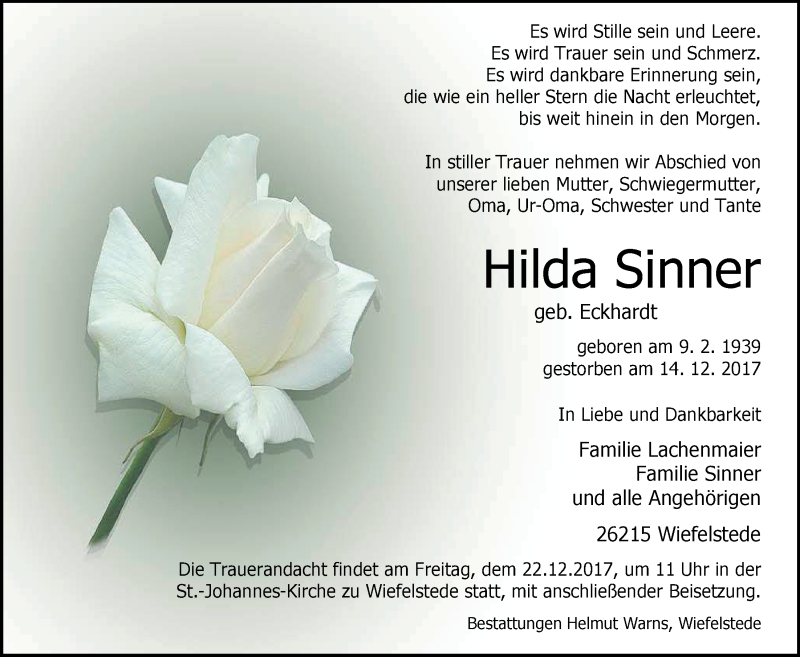 Hier finden Sie alle Traueranzeigen aus der Zeitung, die bisher für Hilda Sinner erschienen sind. Weitere Traueranzeigen, die in der Zeitung erscheinen, werden hier ebenfalls aufgelistet