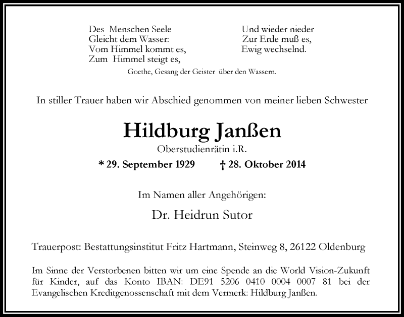 Hier finden Sie alle Traueranzeigen aus der Zeitung, die bisher für Hildburg Janßen erschienen sind. Weitere Traueranzeigen, die in der Zeitung erscheinen, werden hier ebenfalls aufgelistet
