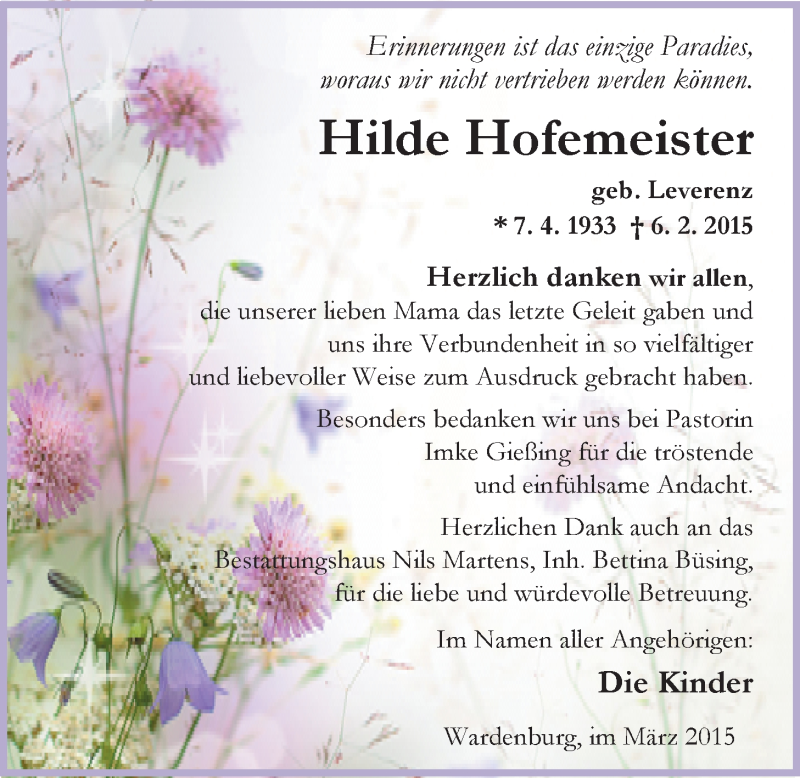 Hier finden Sie alle Traueranzeigen aus der Zeitung, die bisher für Hilde Hofemeister erschienen sind. Weitere Traueranzeigen, die in der Zeitung erscheinen, werden hier ebenfalls aufgelistet