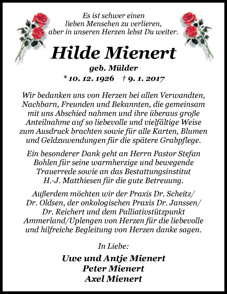 Hier finden Sie alle Traueranzeigen aus der Zeitung, die bisher für Hilde Mienert erschienen sind. Weitere Traueranzeigen, die in der Zeitung erscheinen, werden hier ebenfalls aufgelistet