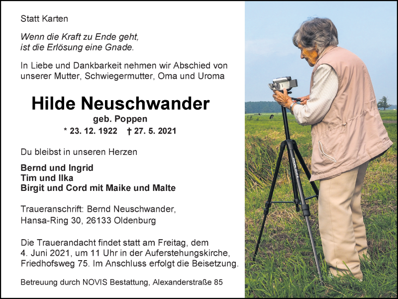 Hier finden Sie alle Traueranzeigen aus der Zeitung, die bisher für Hilde Neuschwander erschienen sind. Weitere Traueranzeigen, die in der Zeitung erscheinen, werden hier ebenfalls aufgelistet