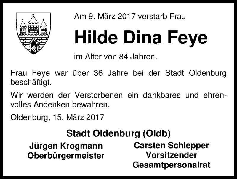 Hier finden Sie alle Traueranzeigen aus der Zeitung, die bisher für Hilde Dina Feye erschienen sind. Weitere Traueranzeigen, die in der Zeitung erscheinen, werden hier ebenfalls aufgelistet