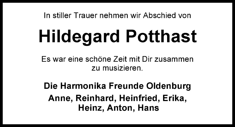 Hier finden Sie alle Traueranzeigen aus der Zeitung, die bisher für Hildegard Potthast erschienen sind. Weitere Traueranzeigen, die in der Zeitung erscheinen, werden hier ebenfalls aufgelistet