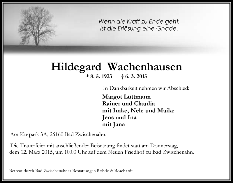 Hier finden Sie alle Traueranzeigen aus der Zeitung, die bisher für Hildegard Wachenhausen erschienen sind. Weitere Traueranzeigen, die in der Zeitung erscheinen, werden hier ebenfalls aufgelistet